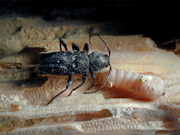 Huisboktor - Uiterlijk: Een volwassen huisboktor is 10 tot 25 mm lang, bruinzwart en heeft 2 grijsachtige vlekken. De larve heeft een lengte tot 30 mm, is geelachtig wit en heeft goed ontwikkelde kaken. De vrouwtjes hebben een lange legboor die onder de dekschilden uitsteekt. Ontwikkeling: Ontwikkelingsduur van ei tot volwassen huisboktor: 3 tot 11 jaar, Ei stadium: 1 tot 2 weken, larve stadium: 3 tot 4 weken. In juni t/m september komen de kevers uit het hout om te gaan paren, waarna het vrouwtje ca. 200 eitjes legt. Leefwijze: De uit de eitjes komende larven boren zich ter plaatse in het hout en maken daarin boor gangen, die geheel met boor meel gevuld worden en een ovale doorsnede hebben. Het hout oppervlak is vaak rimpelig als gevolg van de druk uit de doorgangen op het dunne fineer laagje dat nog intact gebleven is. In de regel wordt de toekomstige uitgang naar buiten al voor de verpopping uitgeknaagd. Er blijft slechts een zeer dun laagje hout aanwezig, waardoor de kever later een uitvlieg opening knaagt. De uitvlieg opening is ovaal, lengte 6 tot 9 mm, gewoonlijk met een gerafelde rand. Schade: Huis boktorren tasten vaak dakconstructies aan. Dikke, dragende balken kunnen in enkele jaren nagenoeg geheel worden verpulverd; bij grenen wordt alleen het spint hout aangetast. Bij vuren wordt ook het kernhout aangetast.